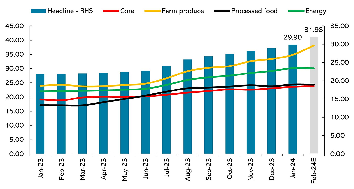This week, we dissect the January 2024 Consumer Price Index (CPI) data published by the NBS and the new circulars rolled out by the CBN in its ongoing reform of the FX market. Starting with the CPI data, Nigeria’s headline inflation rate rose further by 98bps y/y to 29.9% in January (the highest since returning to democracy in 1999), negating our projection of a 40bps moderation to 28.5% premised on a high base effect. On a m/m basis, the headline rate advanced 2.6% (December 2023: 2.3%), marking the highest m/m reading since 3.2% in August 2023 – implying an annualised rate of 31.2% as against FG’s target of 21.4%.